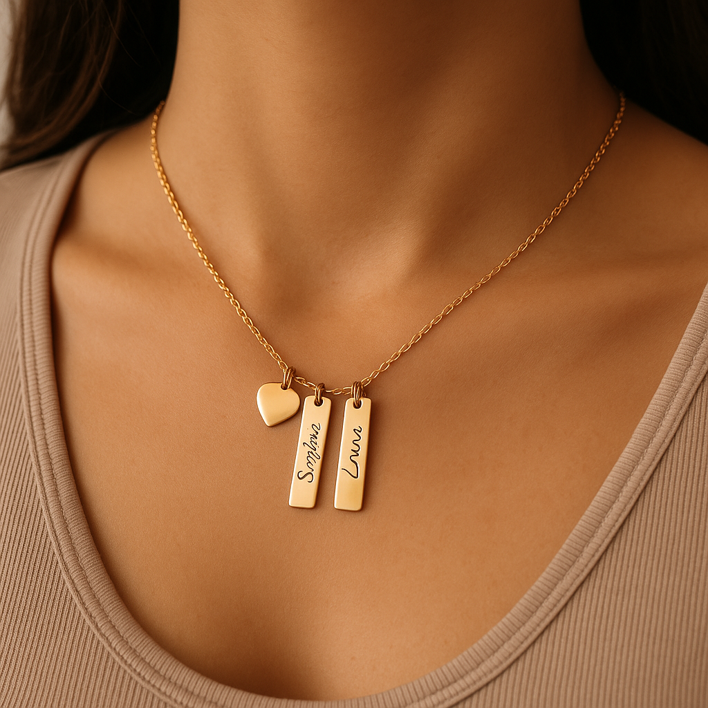 Ajoutez les prénoms de vos enfants, une date ou un message spécial sur les 3 pendentifs (2 barres + 1 cœur).