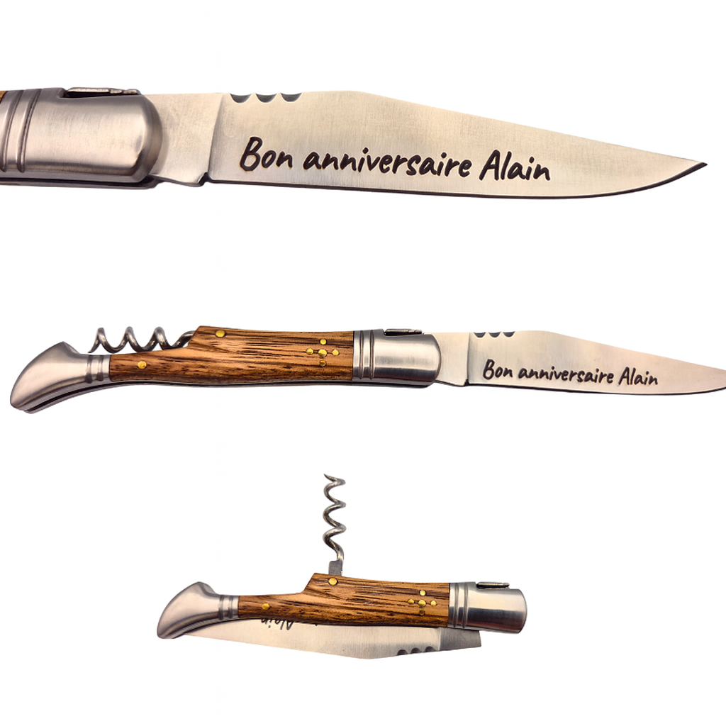 Offrez un couteau Laguiole unique en son genre, gravé selon vos envies ! Ce magnifique couteau pliant est doté d’un manche en bois naturel, d’une lame en acier inoxydable et d’un tire-bouchon intégré, parfait pour les amateurs de tradition et de beaux objets.